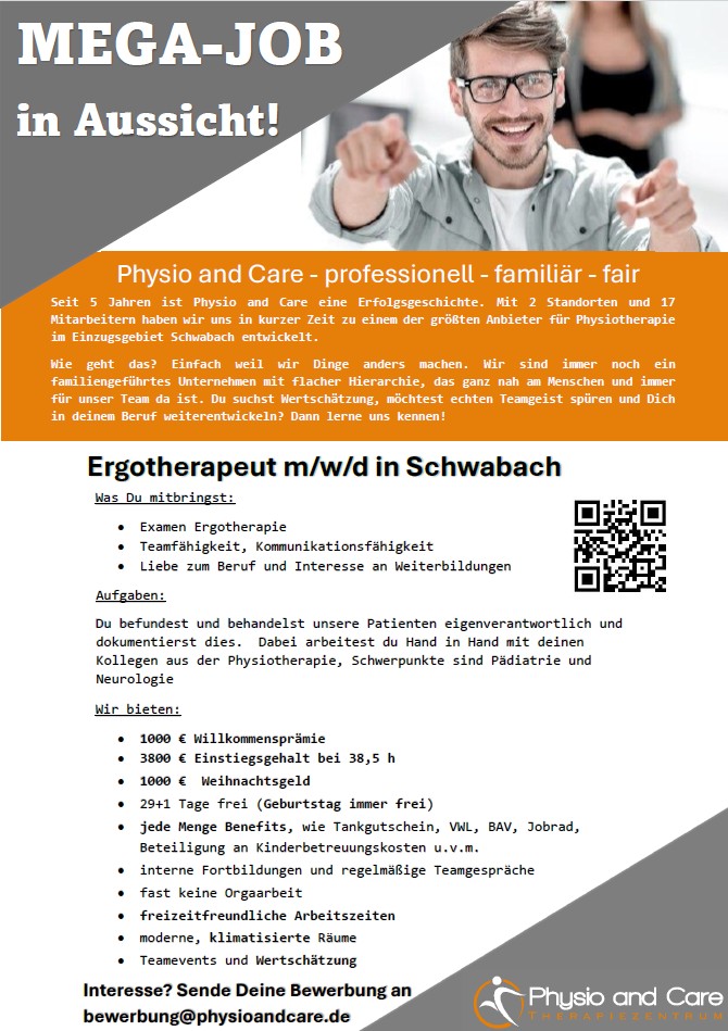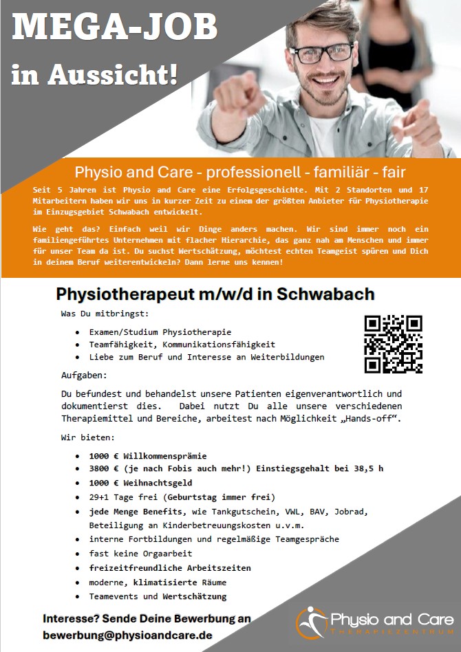 Seit 5 Jahren ist Physio and Care eine Erfolgsgeschichte. Mit 2 Standorten und 17 Mitarbeitern haben wir uns in kurzer Zeit zu einem der größten Anbieter für Physiotherapie im Einzugsgebiet Schwabach entwickelt.